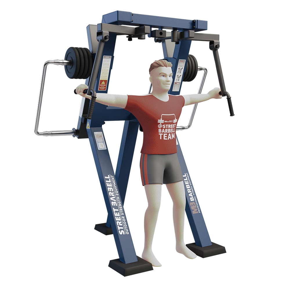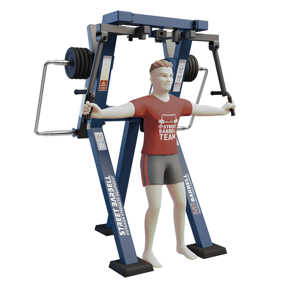 MB 7.31 Butterfly Work out standing, experience a completely new training feeling and perfect biomechanics outdoors Specifications Plates: 8 x 10 kg and 6 x 2.5 kg Dimensions: length 1330 mm x width 1810 mm x height 2110 mm Weight: 285 kg Muscles: Chest Frame: Steel, zink primer with powder coating plus extra clear coating finish Rails: Stainless Steel Small Parts: Stainless Steel